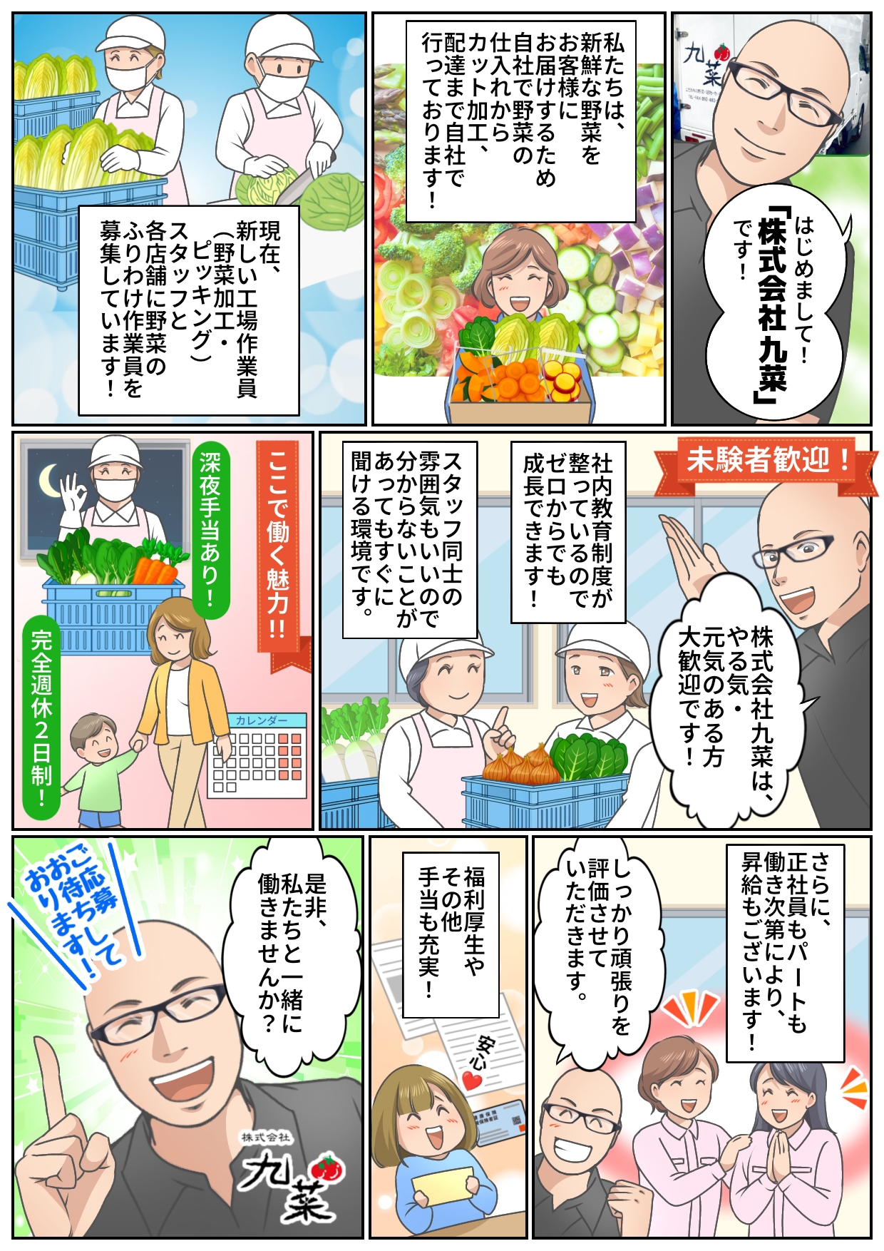 株式会社九菜は、福岡市の青果卸の会社です。当社では入れからカット加工、配達まですべての工程を自社で一貫して行っています。この度、業務拡大に伴い新たな正社員、アルバイトスタッフの募集を行うこととなりました。経験の有無や年齢を問わず広く募集しているため、地元地域で働きたい方や当社の業務にご興味がある方は、お気軽にお問い合わせください。前向きで真面目に取り組んでくださる方のご応募お待ちしております!